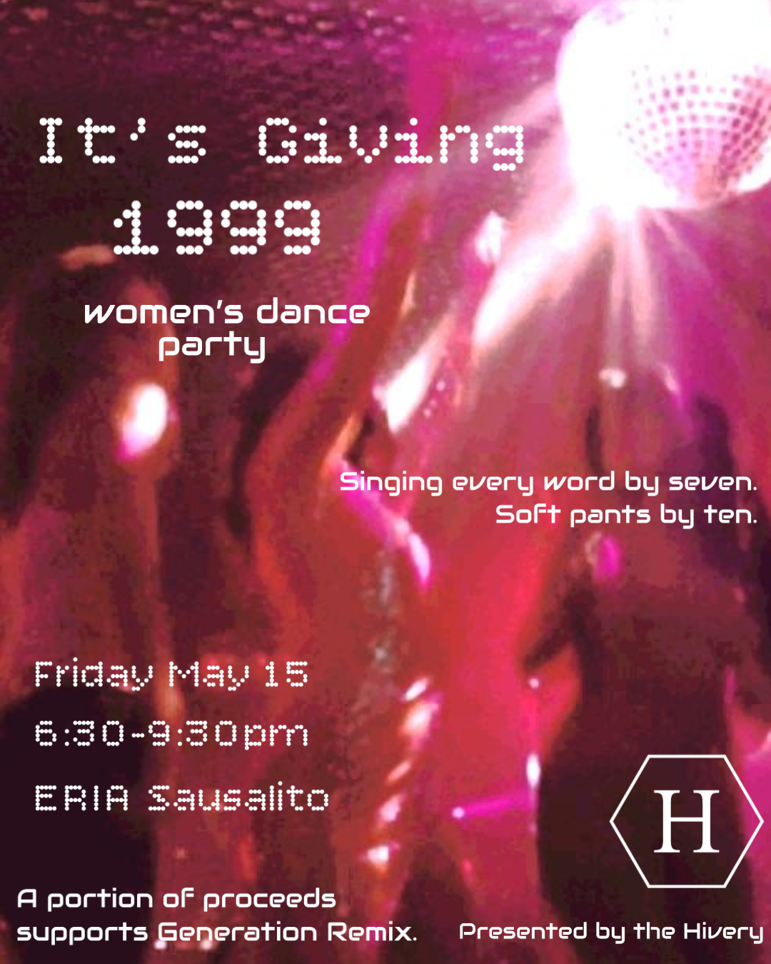 Join us for It’s Giving 1999—an early evening dance party for women who love a good time without staying out too late. This is a high-energy, joy-filled Friday night designed for the Marin community and The Hivery aesthetic: elevated, effortless, and full of connection.